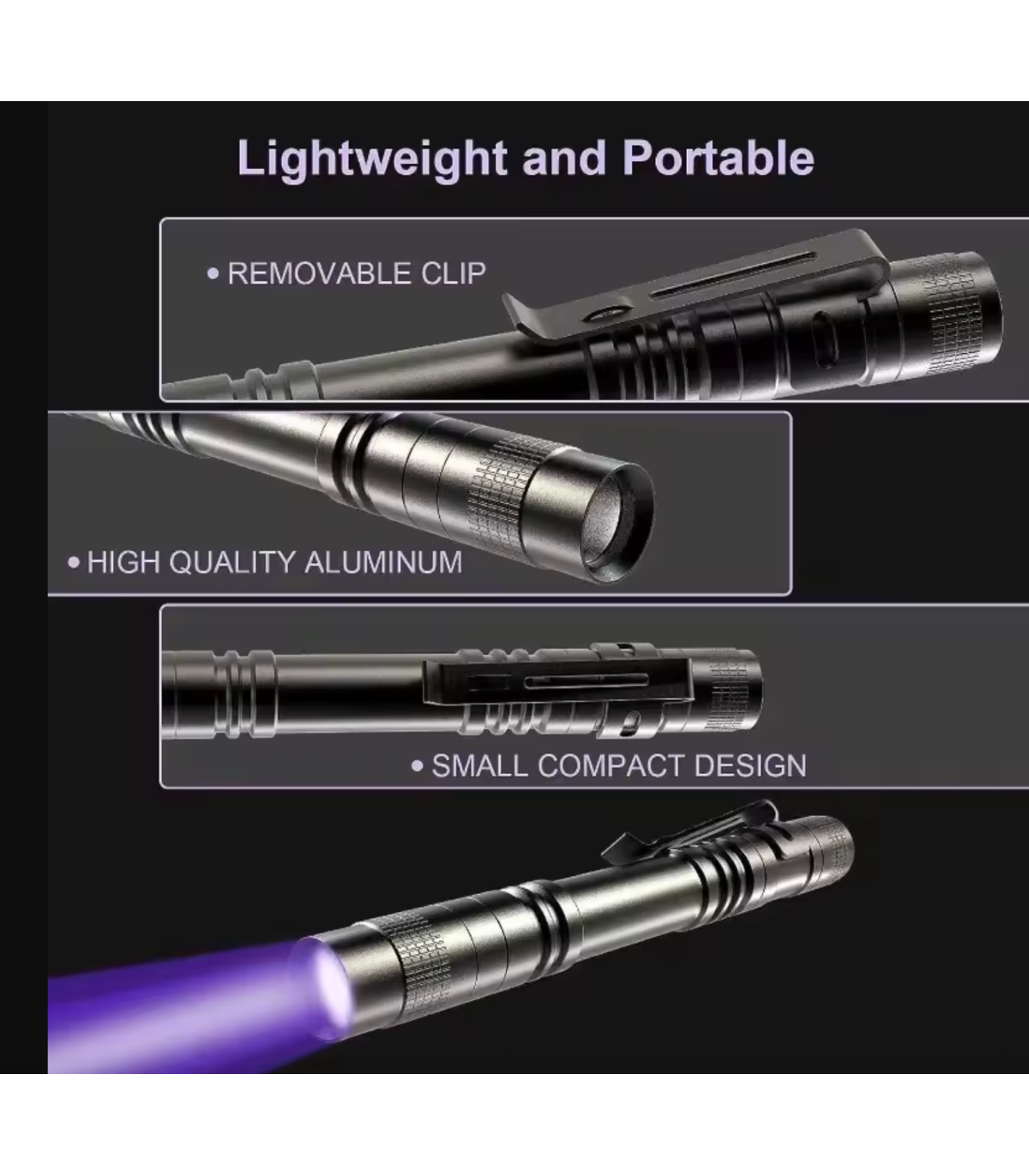 The 395nm UV Mini Pen Torch Light is a compact and powerful ultraviolet flashlight designed for multiple applications such as resin curing, fluorescent detection, electronic repair, and inspection tasks.