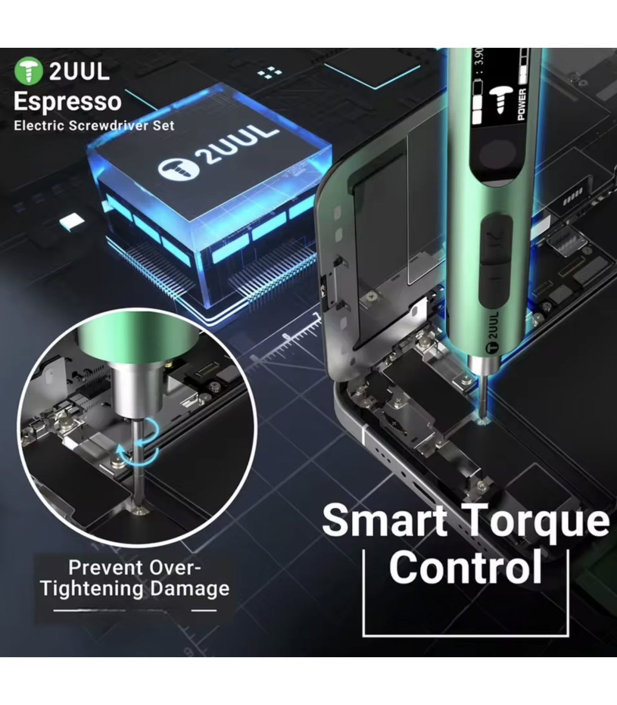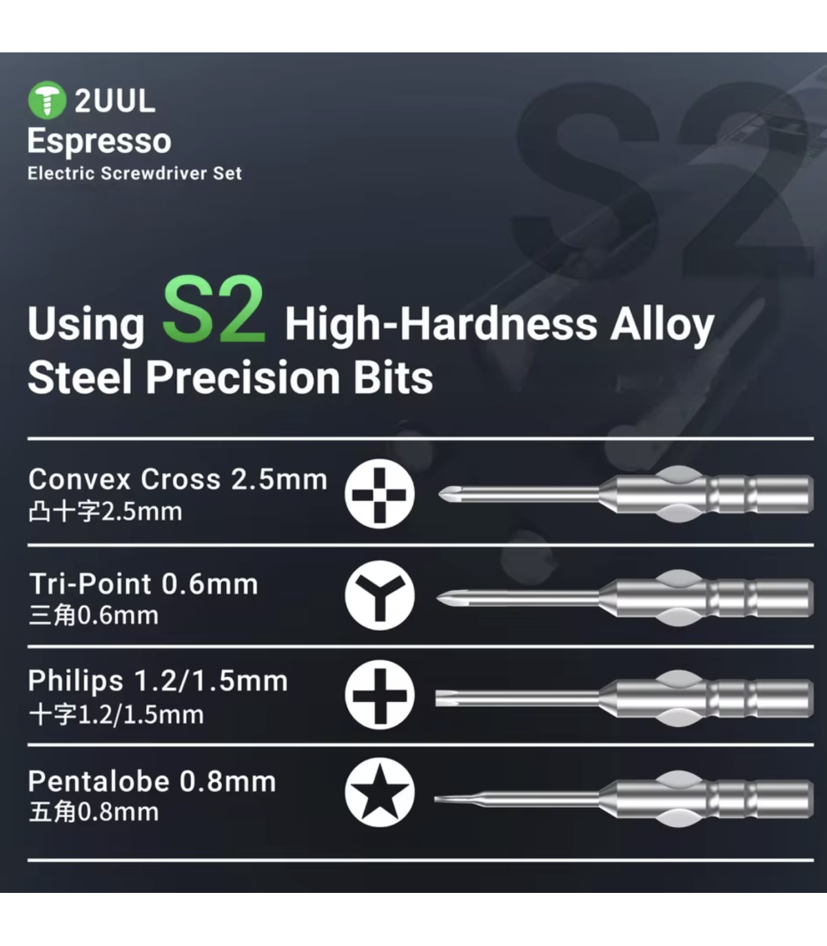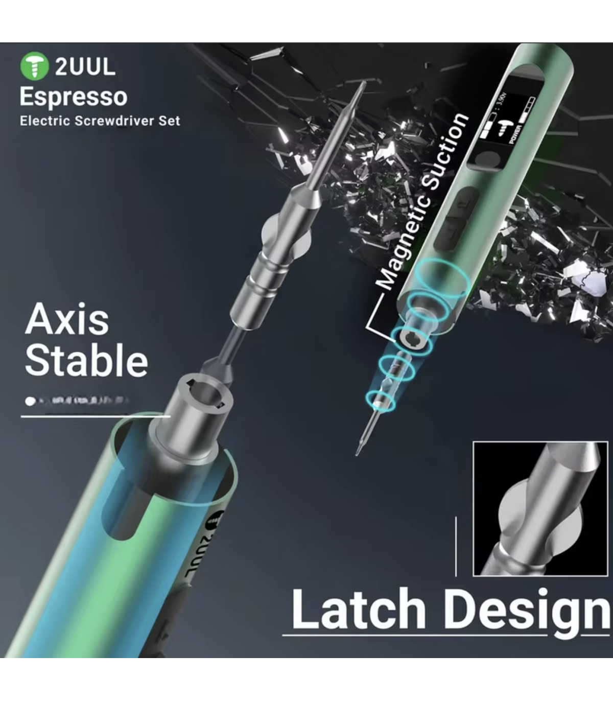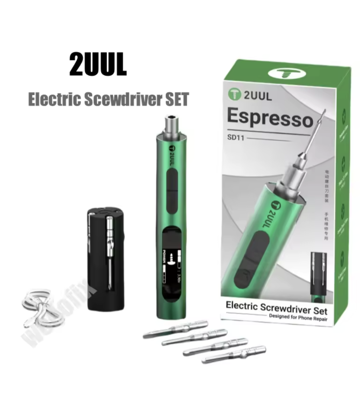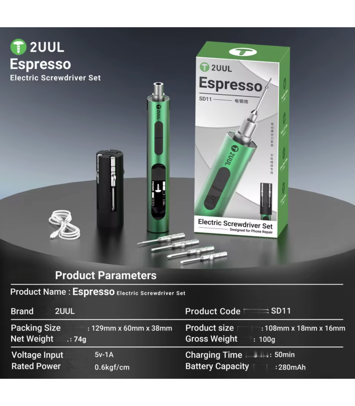 2UUL SD11 Espresso Electric Screwdriver with 4pcs S2 Bits and smart torque control for mobile phone repair. 2UUL SD11 portable electric screwdriver with 5 torque gears, Type-C charging, magnetic storage 2.5mm, Y0.6mm, Philips and 0.8mm bits, perfect for daily mobile phone teardown or electronic product disassembly and assembly.