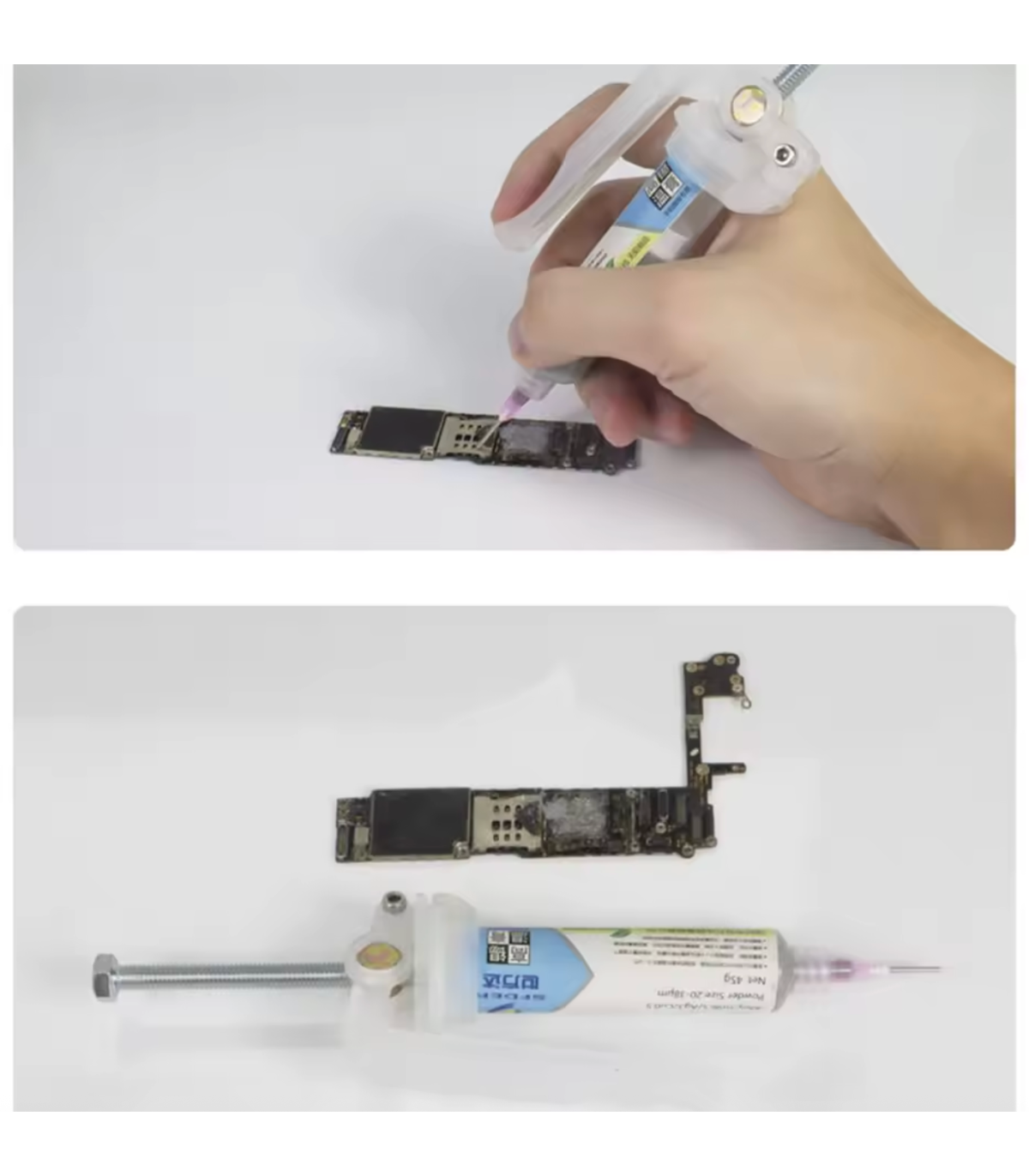 It fits standard 5cc and 10cc syringe cartridges, making it useful for PCB soldering, rework stations, micro-soldering, and general electronics repair tasks.