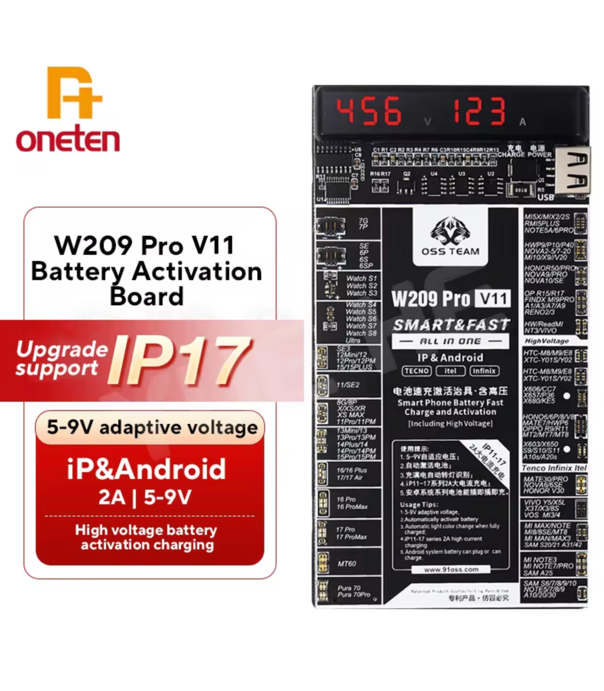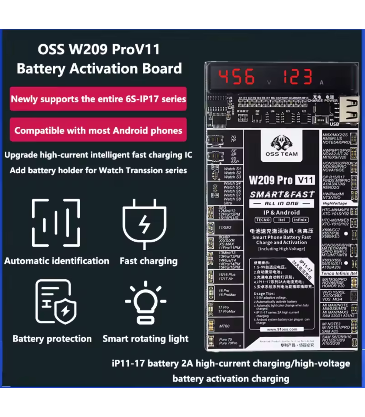 This OSS W209 Pro V11 Activation Fast Battery Charger Booster is a multifunctional 2-in-1 tool designed for quick battery charging, activation, and diagnostic support for both iOS and Android devices.