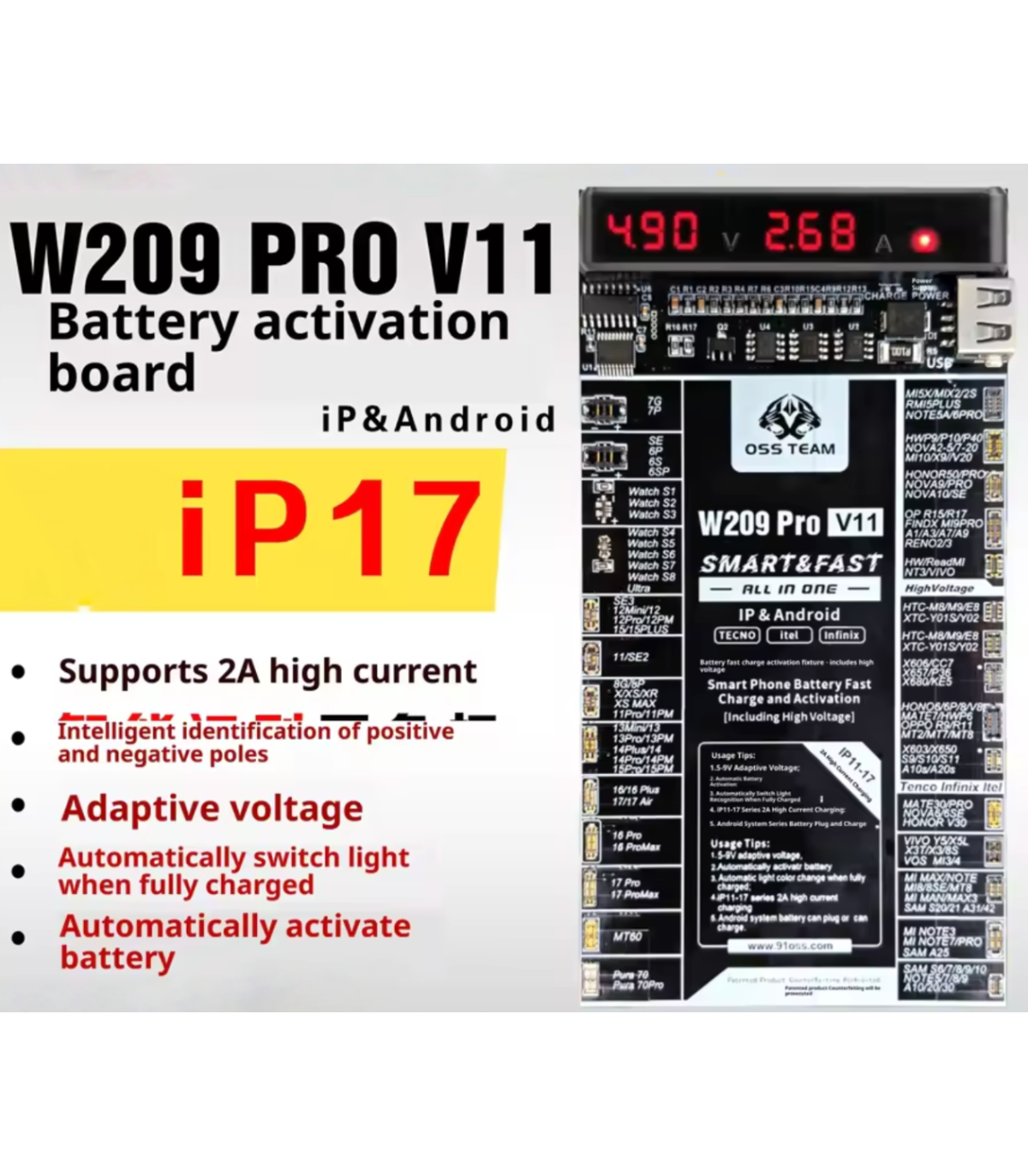 Engineered for precision, the W209 Pro V11 supports a wide range of devices, including iPhone 6 to iPhone 17 series, Samsung, OPPO, VIVO, Xiaomi, Huawei, Tecno, Infinix, and 90% of Android batteries through auto-protocol recognition.
