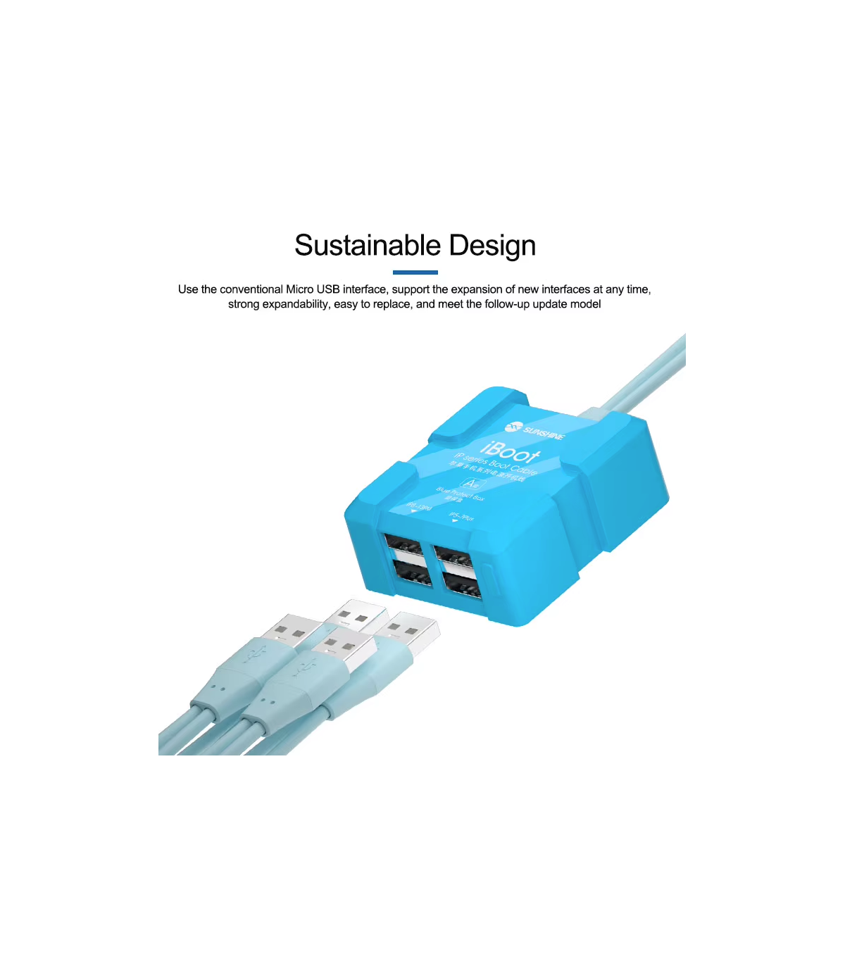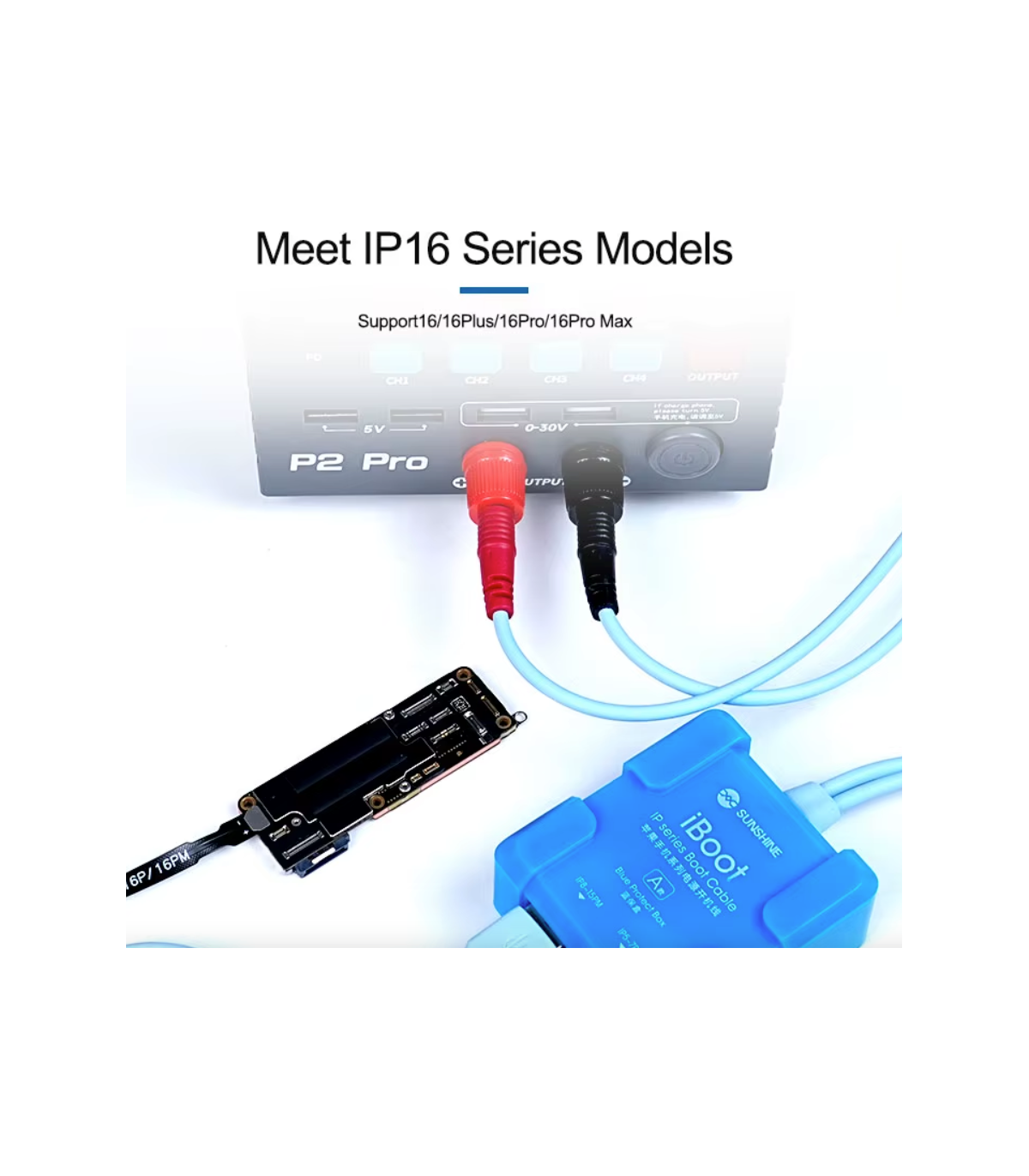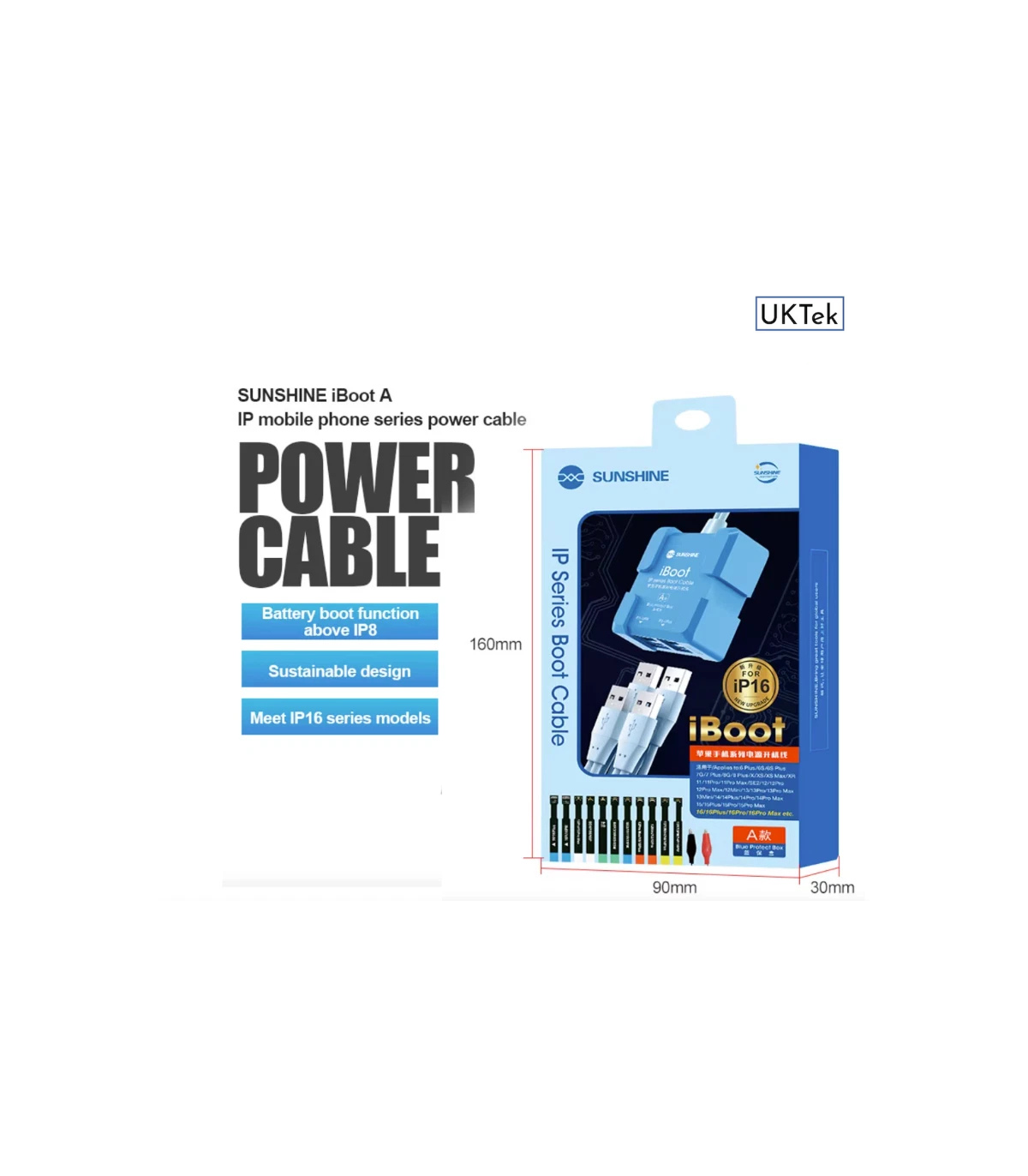 The Sunshine iBoot USB DC power supply test cable for iPhone 6 - 17 series features a built-in battery boot function, smart anti-burn protection, and wide compatibility, making it ideal for technicians working on iPhone models from 6S up to 17 Pro Max.