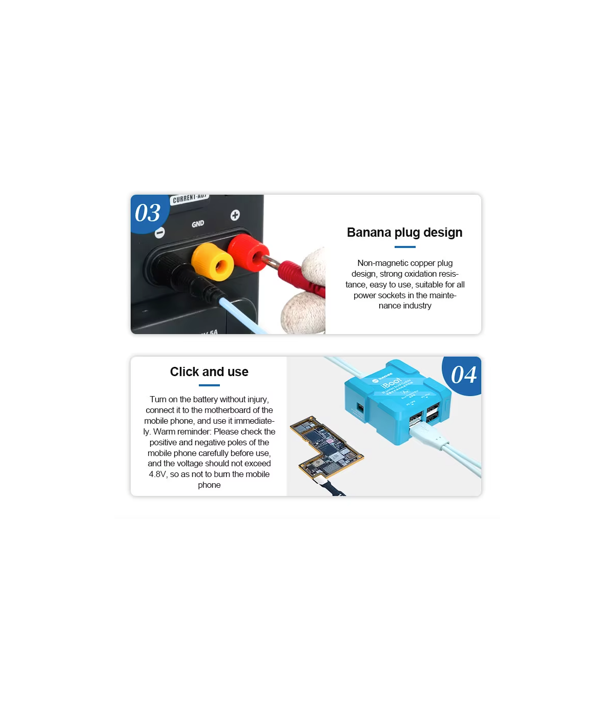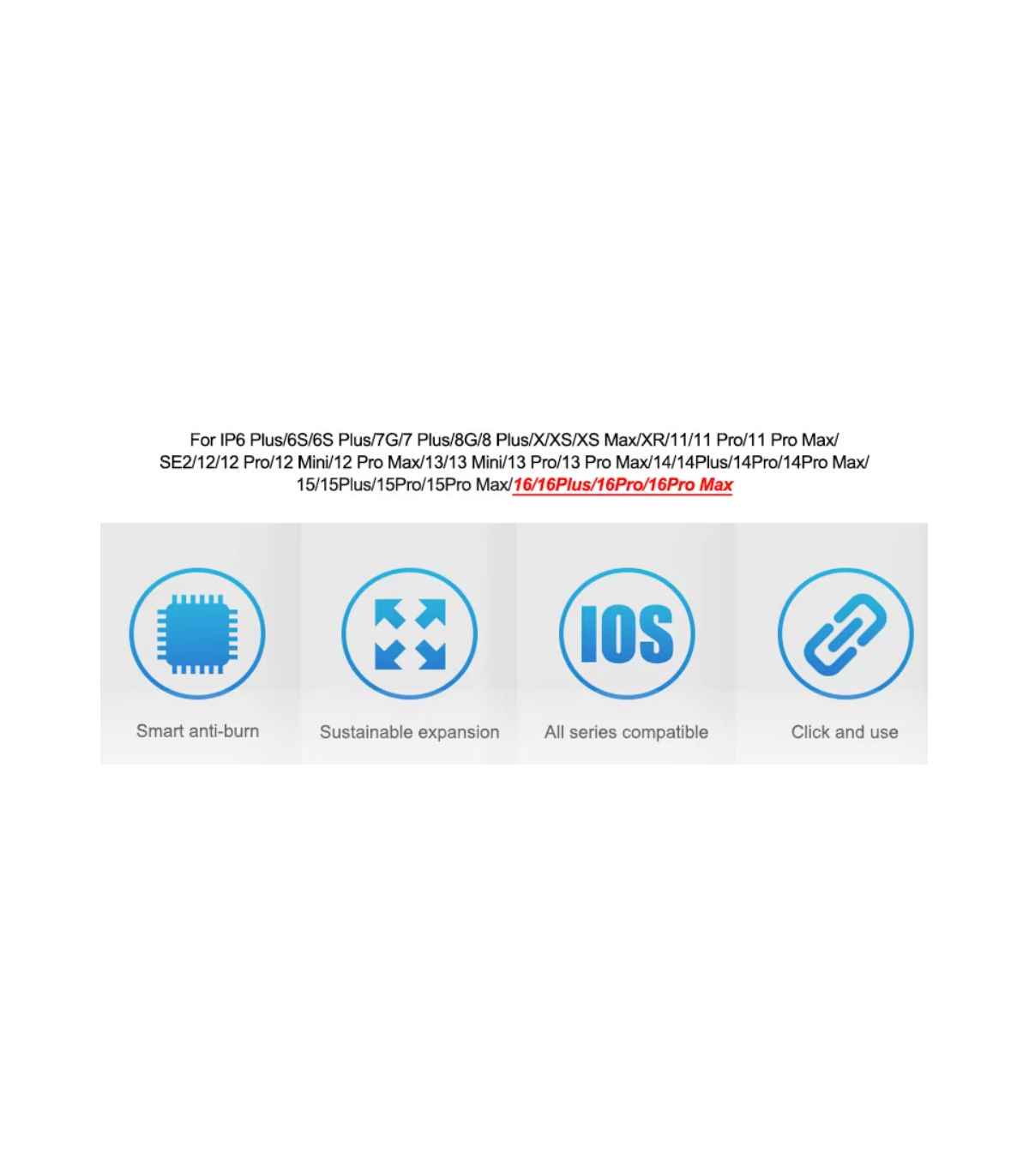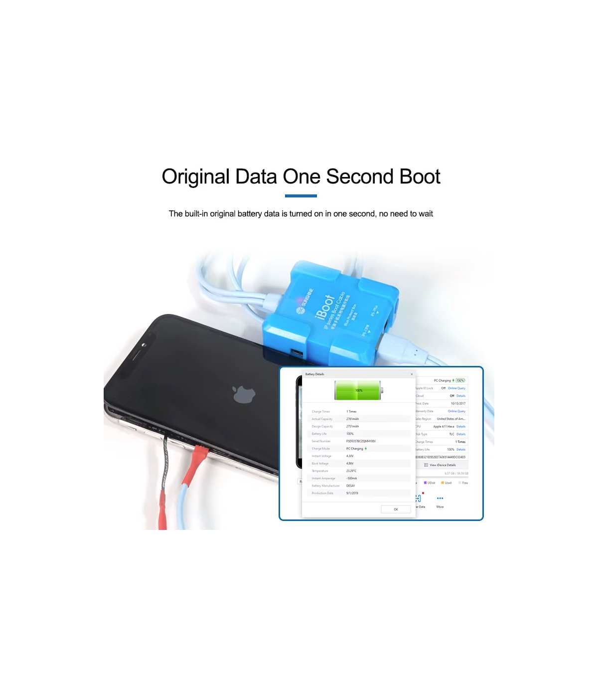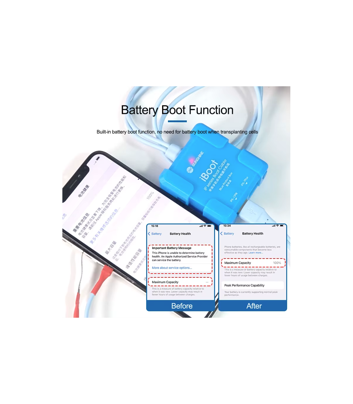 The Sunshine iBoot USB DC power supply test cable for iPhone 6 - 17 series features a built-in battery boot function, smart anti-burn protection, and wide compatibility, making it ideal for technicians working on iPhone models from 6S up to 17 Pro Max.