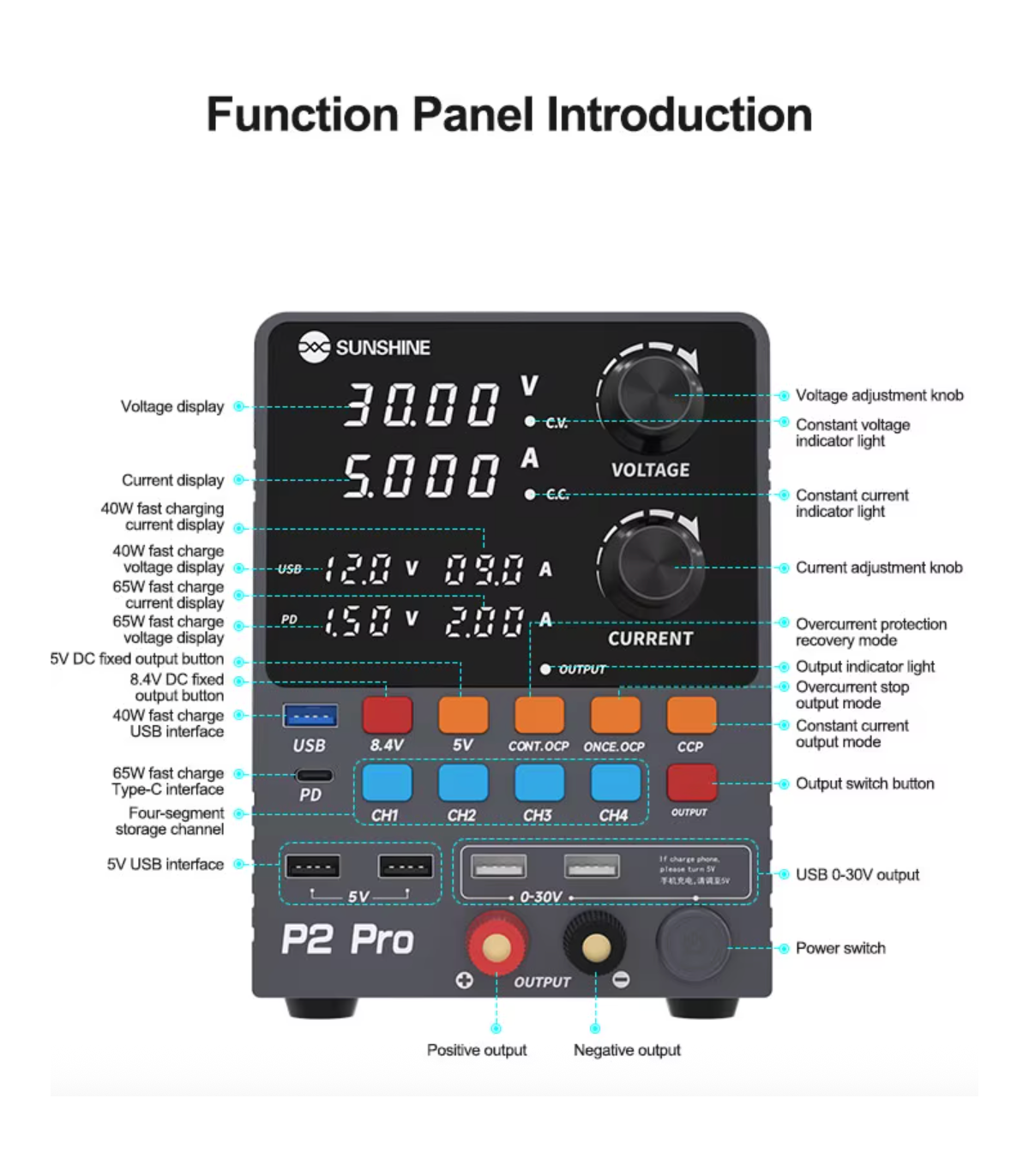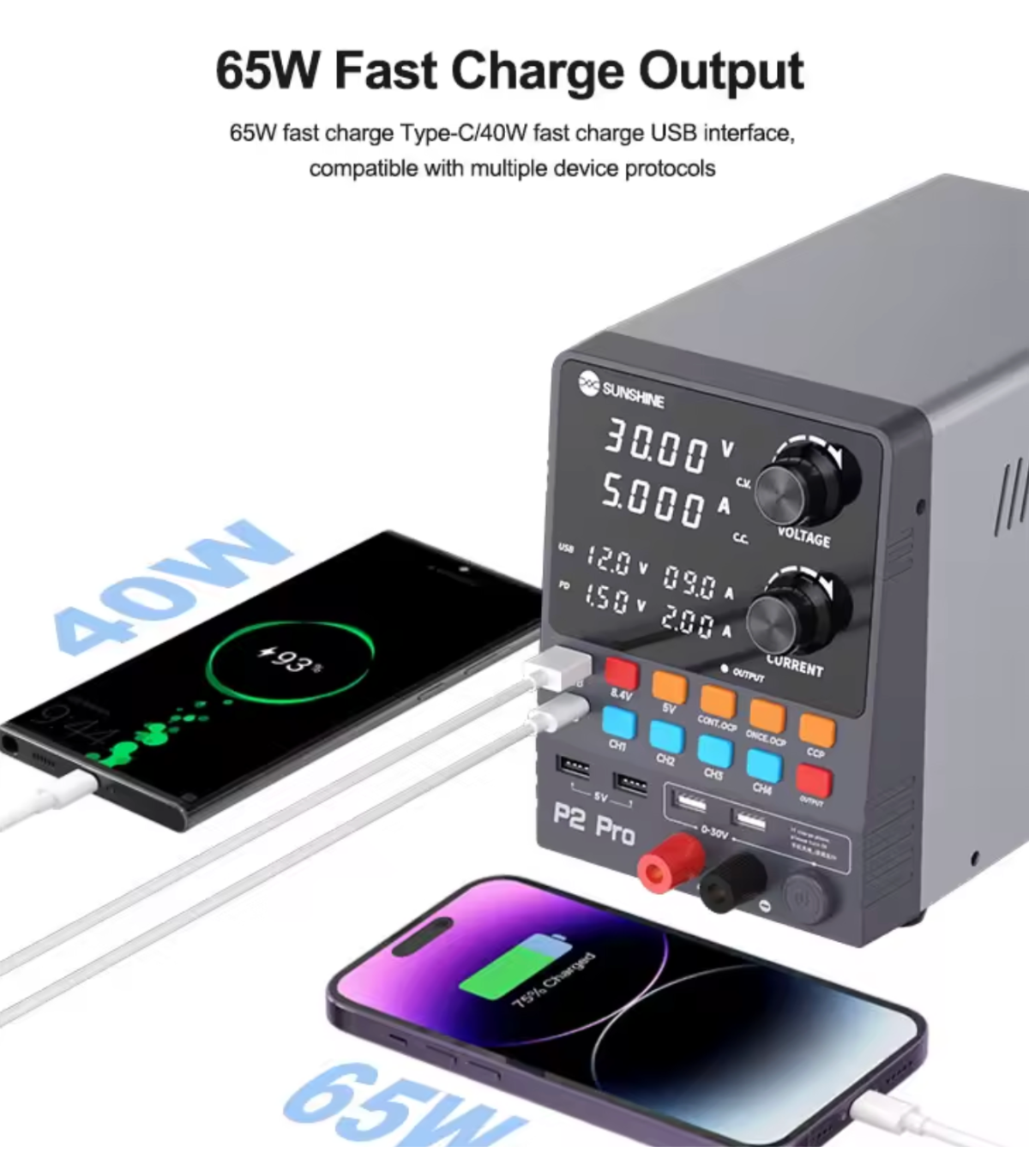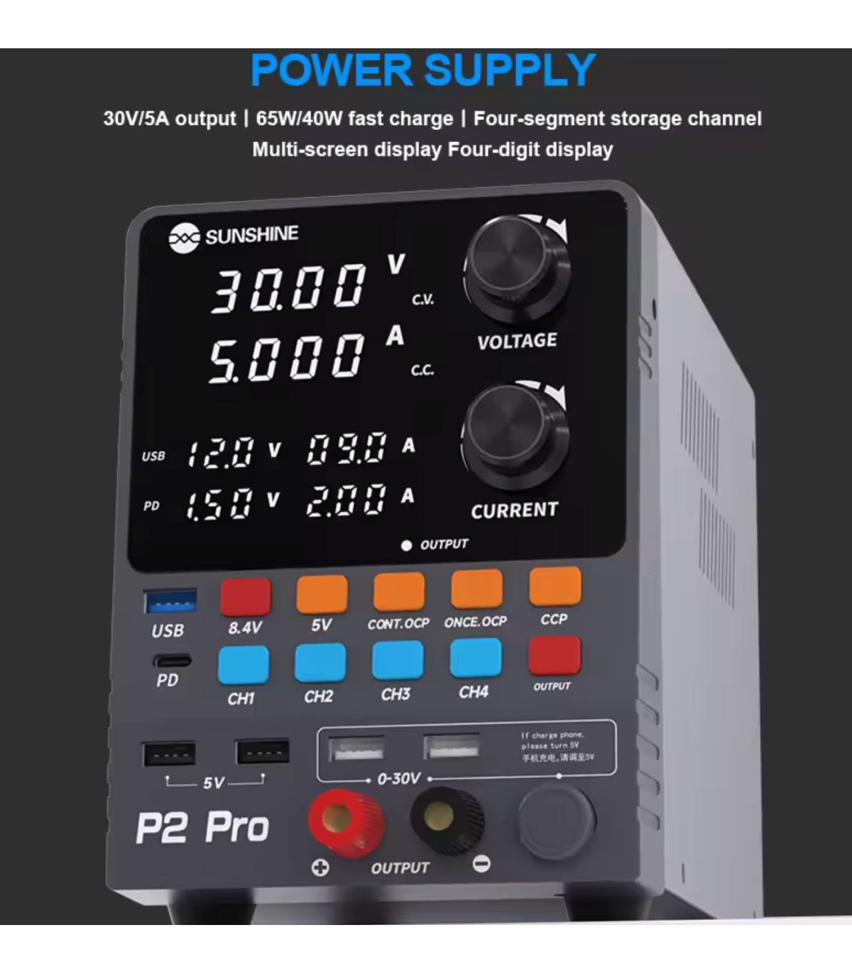 The SUNSHINE P2 PRO Regulated DC Power Supply is a high-precision, high-frequency power tool designed for mobile phone repair, electronics testing, and precision lab applications.