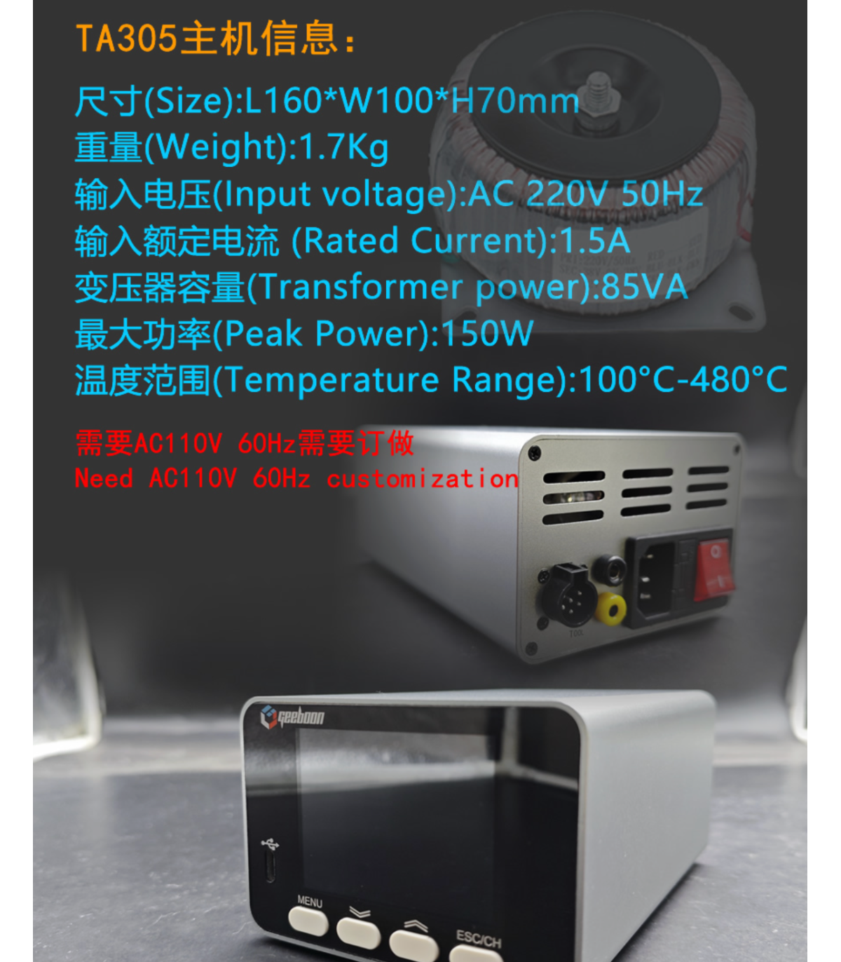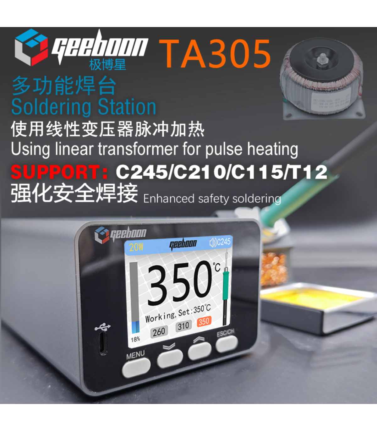 The GEEBOON 150W TA305 Linear Transformer Soldering Solder Iron Station C245 C210 Kit is a professional soldering station designed for mobile phone repair, industrial control systems, ECU maintenance, and precision electronics soldering. This GEEBOON TA305 linear transformer soldering station uses AC pulse heating technology and advanced safety detection to provide stable and controlled soldering performance.