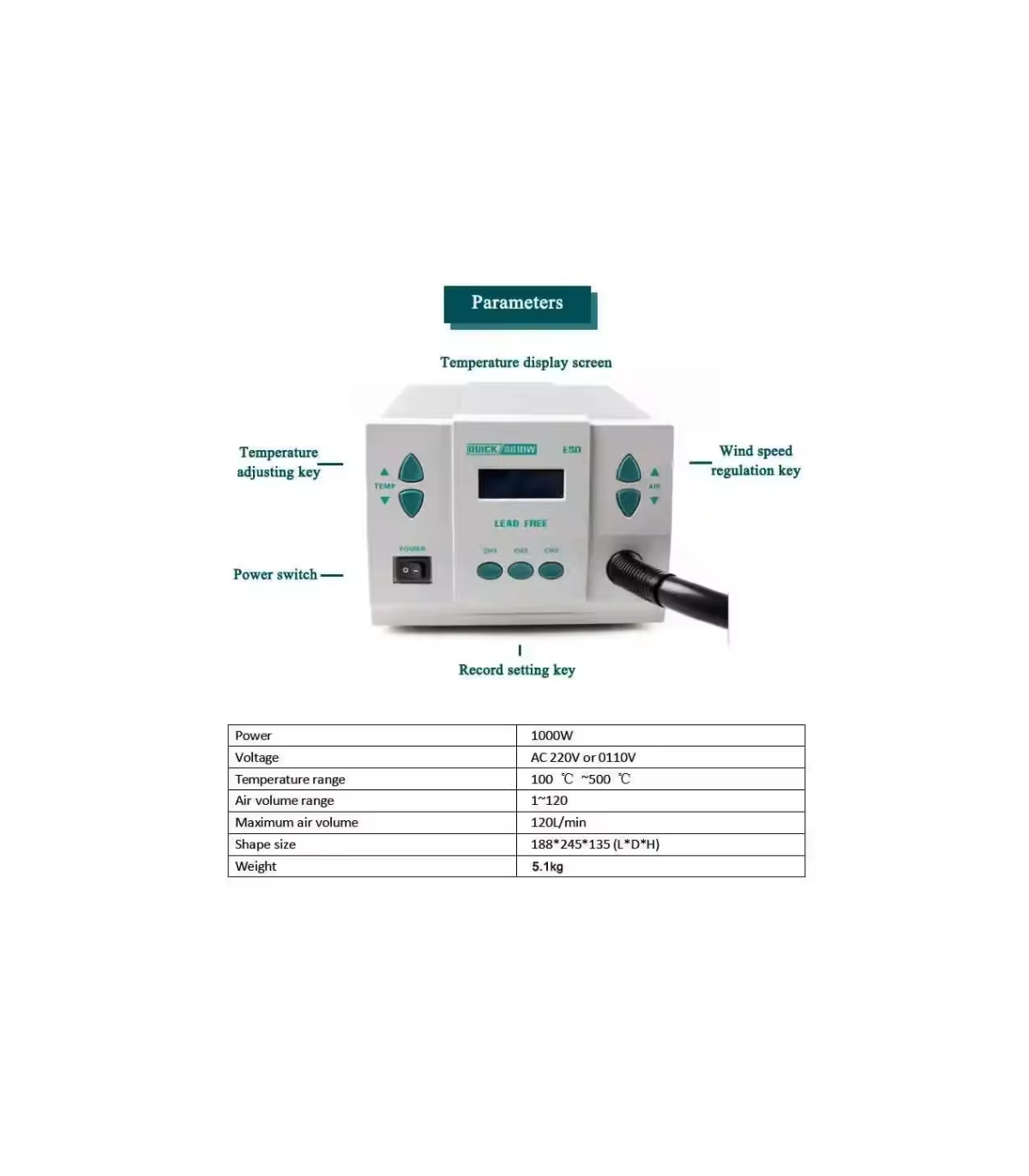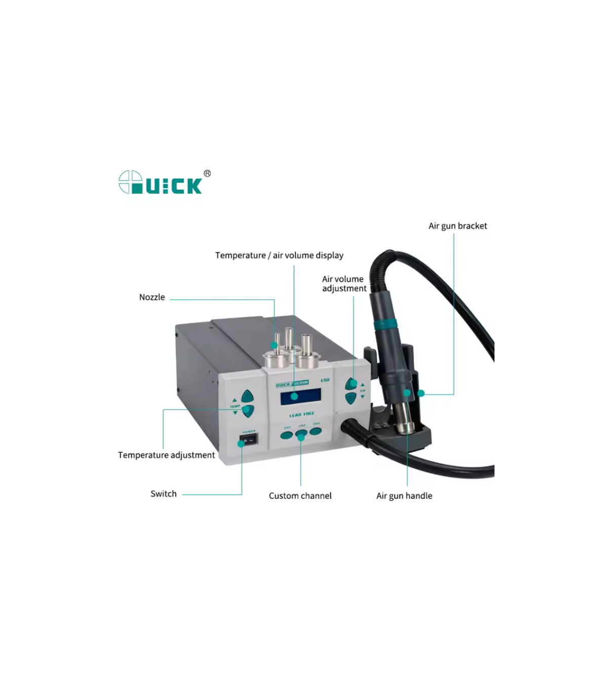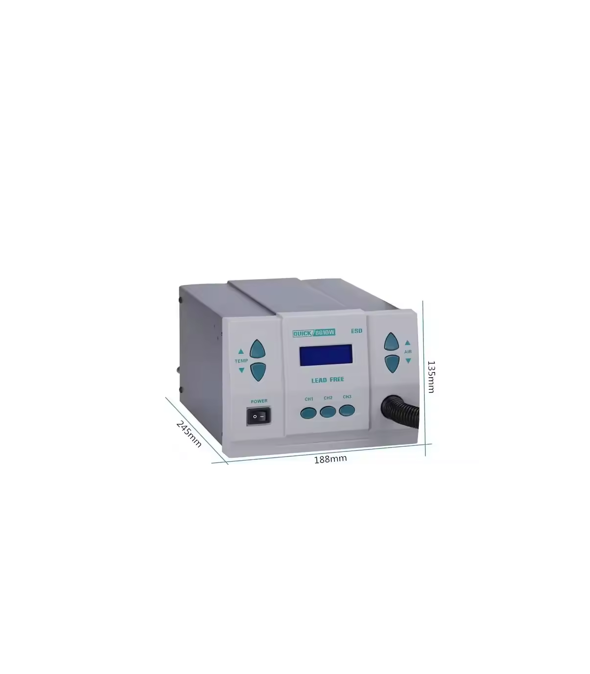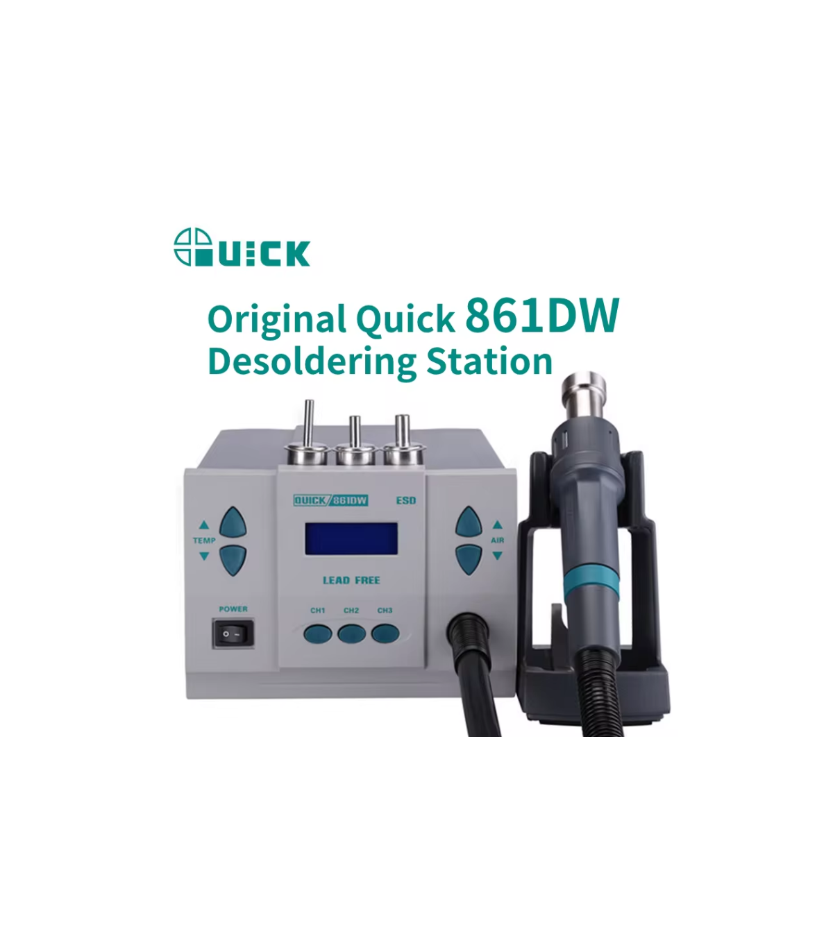 The Quick 861DW Hot Air Rework Station is a high-performance tool for smd soldering, PCB repair, and electronic component rework. With 1000W power and precise temperature control, it delivers stable airflow and heat, making it ideal for removing or soldering small surface-mounted components efficiently. Perfect for professional technicians and electronics repair enthusiasts.