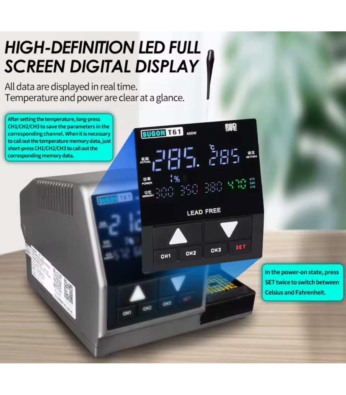 The SUGON T61 Solder Station 400W Soldering Iron T245 Handle with 3pcs Tips is a high-power industrial soldering station designed for mobile phone PCB repair, BGA and SMD chip soldering, motherboard work, and precision electronics repair. This SUGON T61 400W solder station delivers fast temperature recovery, stable heat output, and reliable performance for professional repair environments.