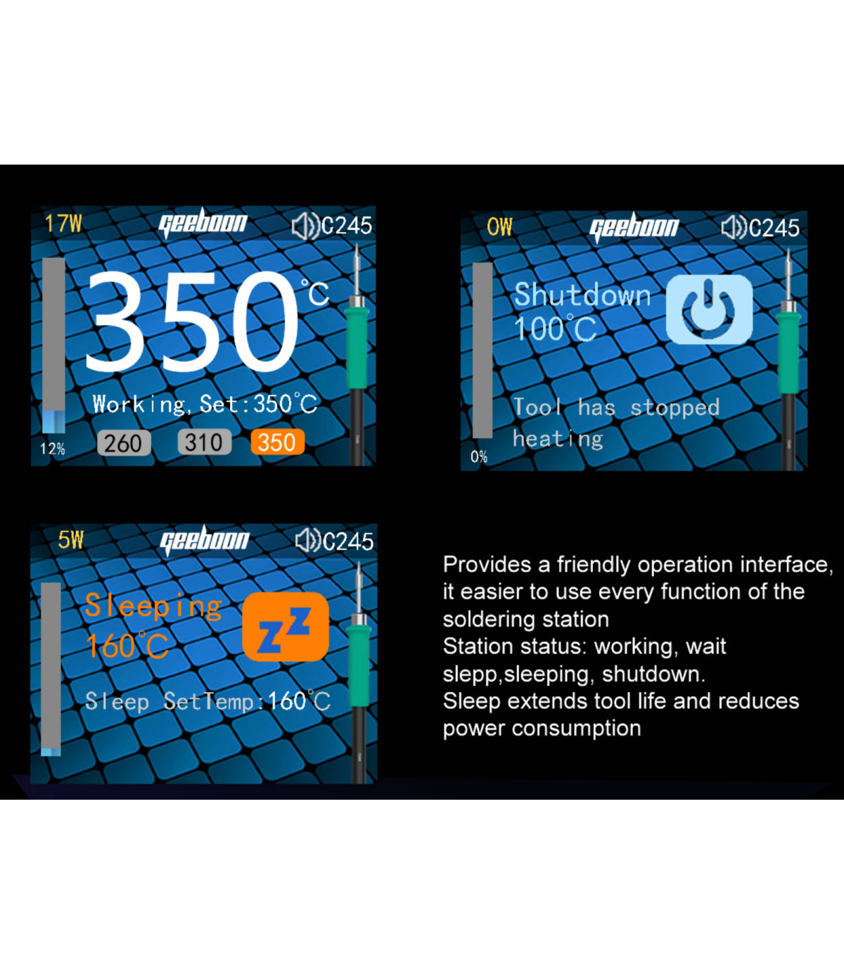 Equipped with a 2.0-inch color display, PID temperature control, and advanced sleep functions, the GEEBOON 240W TC22 soldering solder station ensures consistent soldering performance while extending soldering tip lifespan.