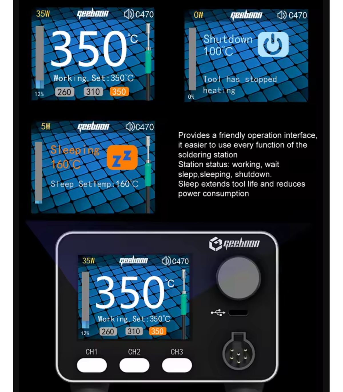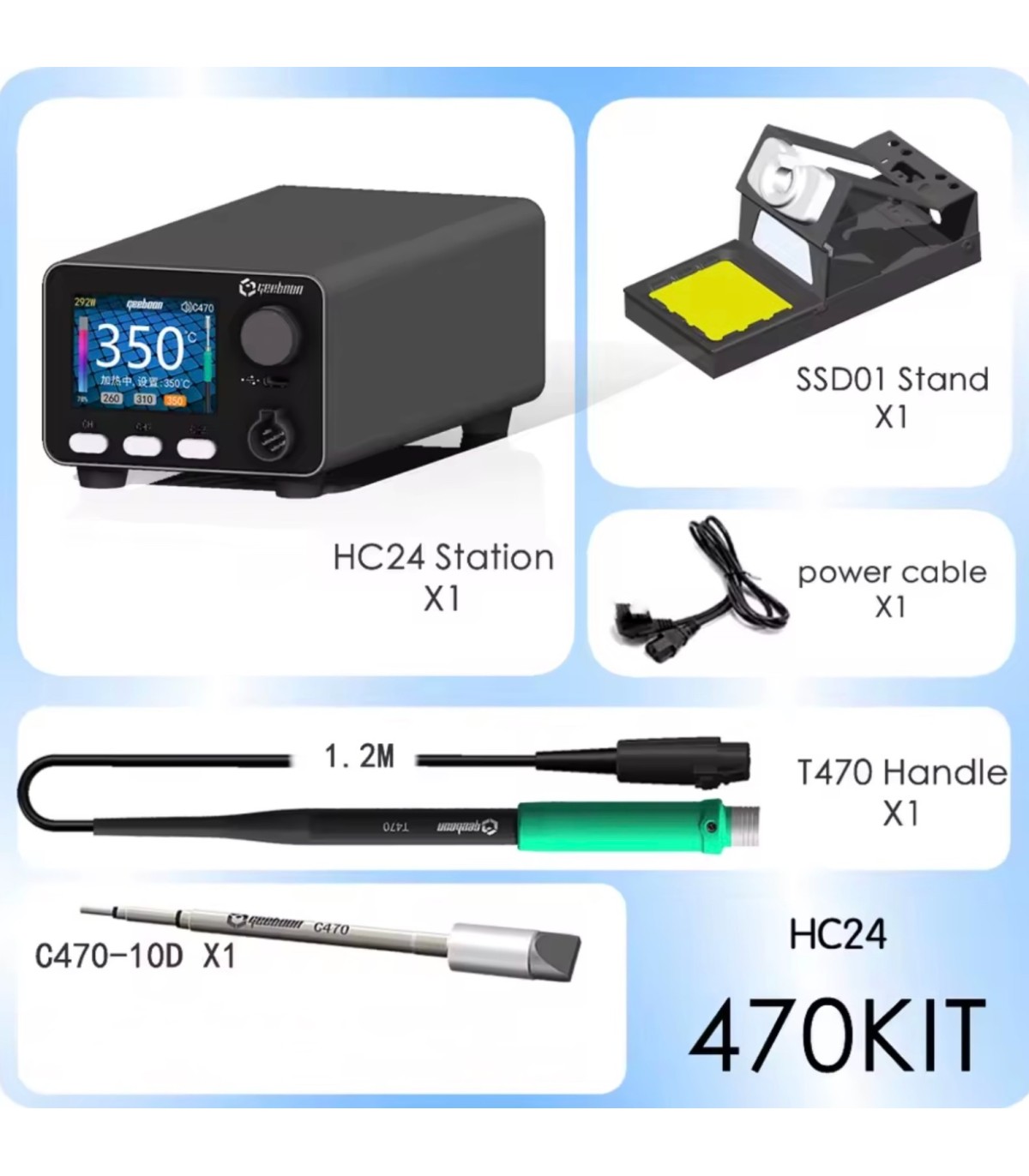 Equipped with PID temperature control, dynamic temperature compensation, and an IPS color display, the GEEBOON HC24 heavy-duty soldering station C470 kit delivers stable heating, fast thermal recovery, and precise control for continuous soldering operations.
