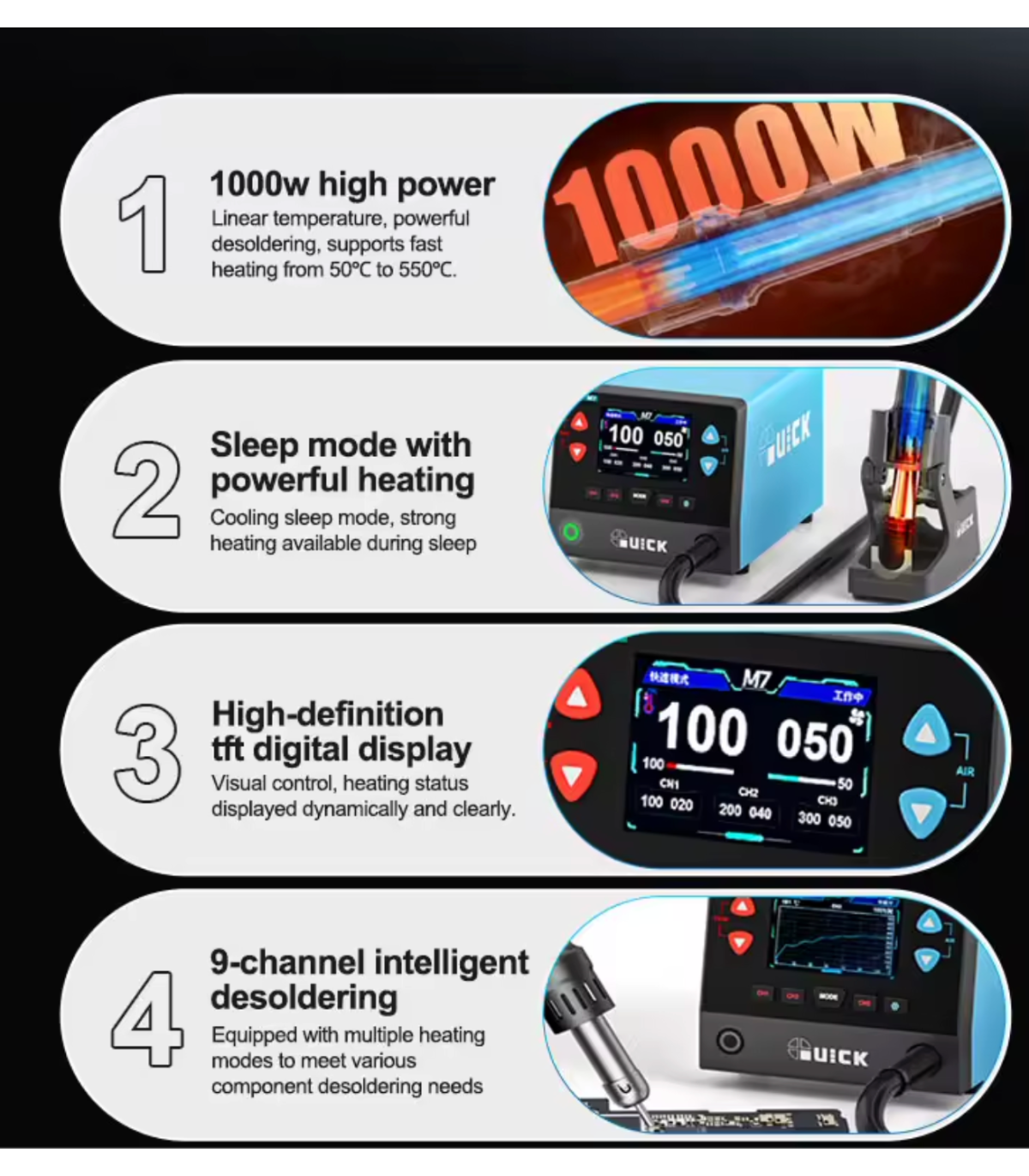 The QUICK M7 1000W Intelligent Lead-Free Hot Air Desoldering Station is a powerful and precise repair tool designed for professional electronics repair, including mobile phones, tablets, laptops, and PCB boards.