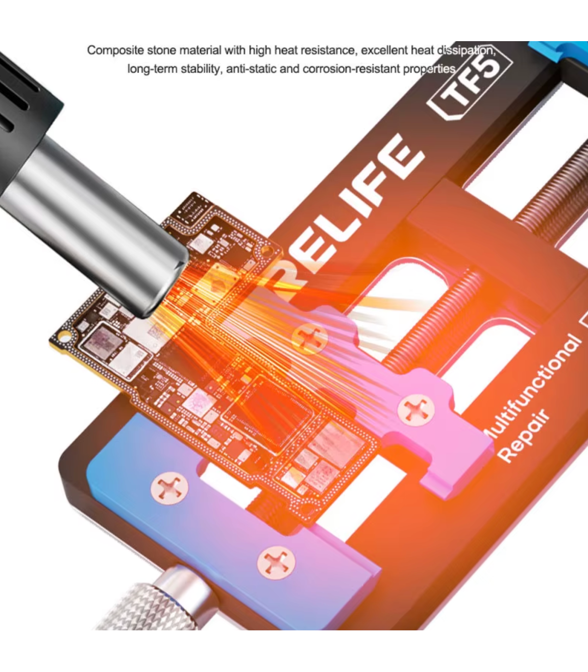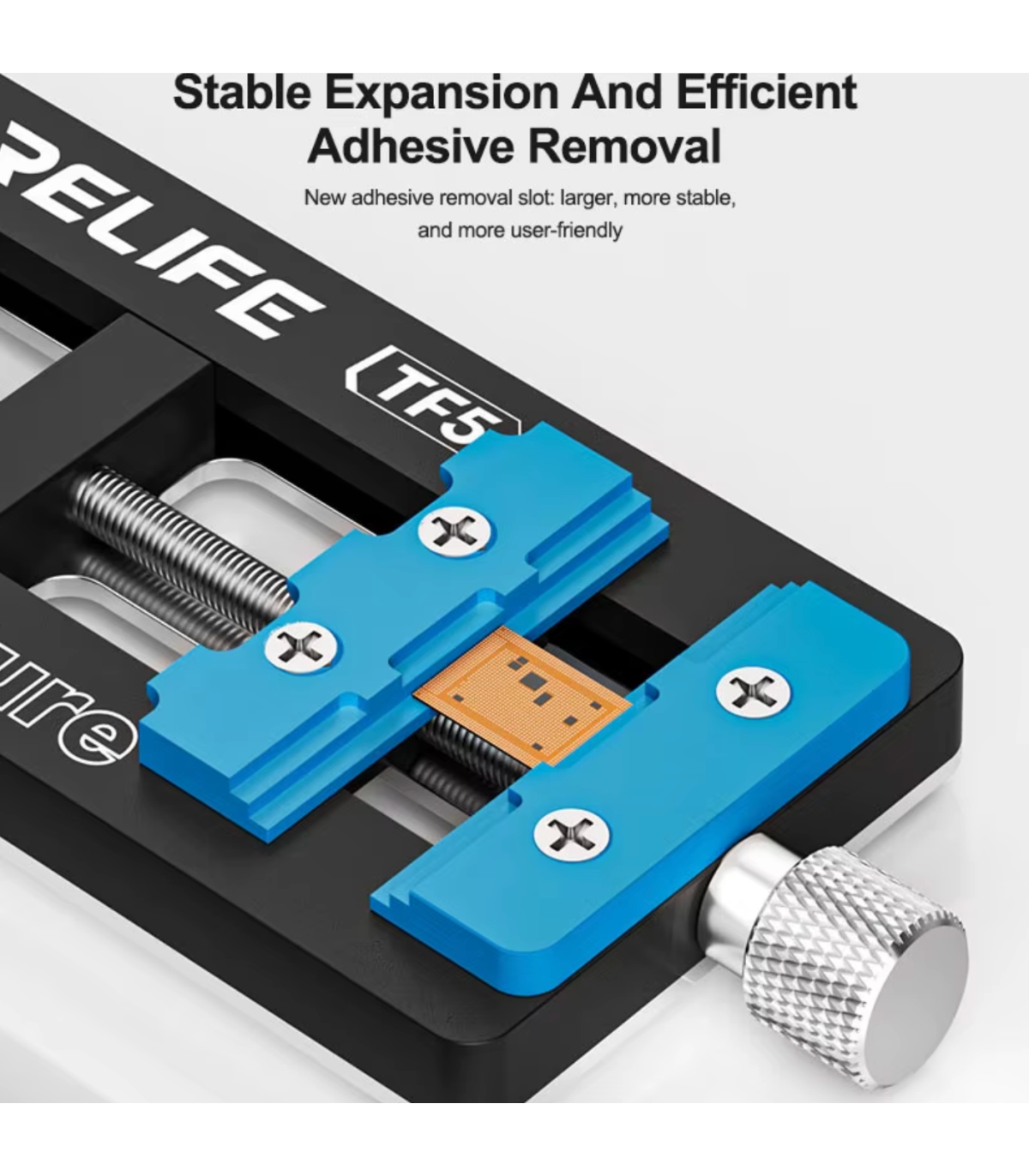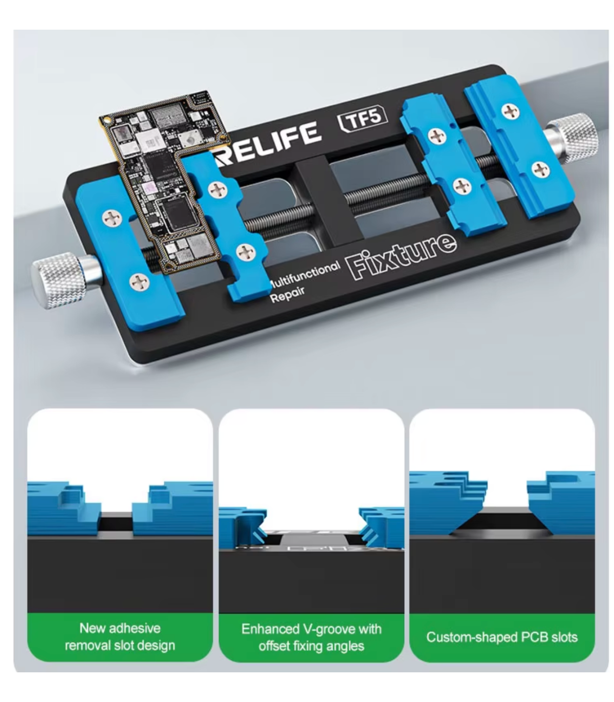 The Relife RL-TF5 Fixture for Phone Logic Board IC CPU Repair Soldering Rework is a professional repair tool designed for securely holding mobile phone logic boards during soldering and rework operations. This Relife RL-TF5 fixture for phone logic board IC CPU repair soldering rework provides stable positioning for precise work on delicate components such as IC chips and CPU.