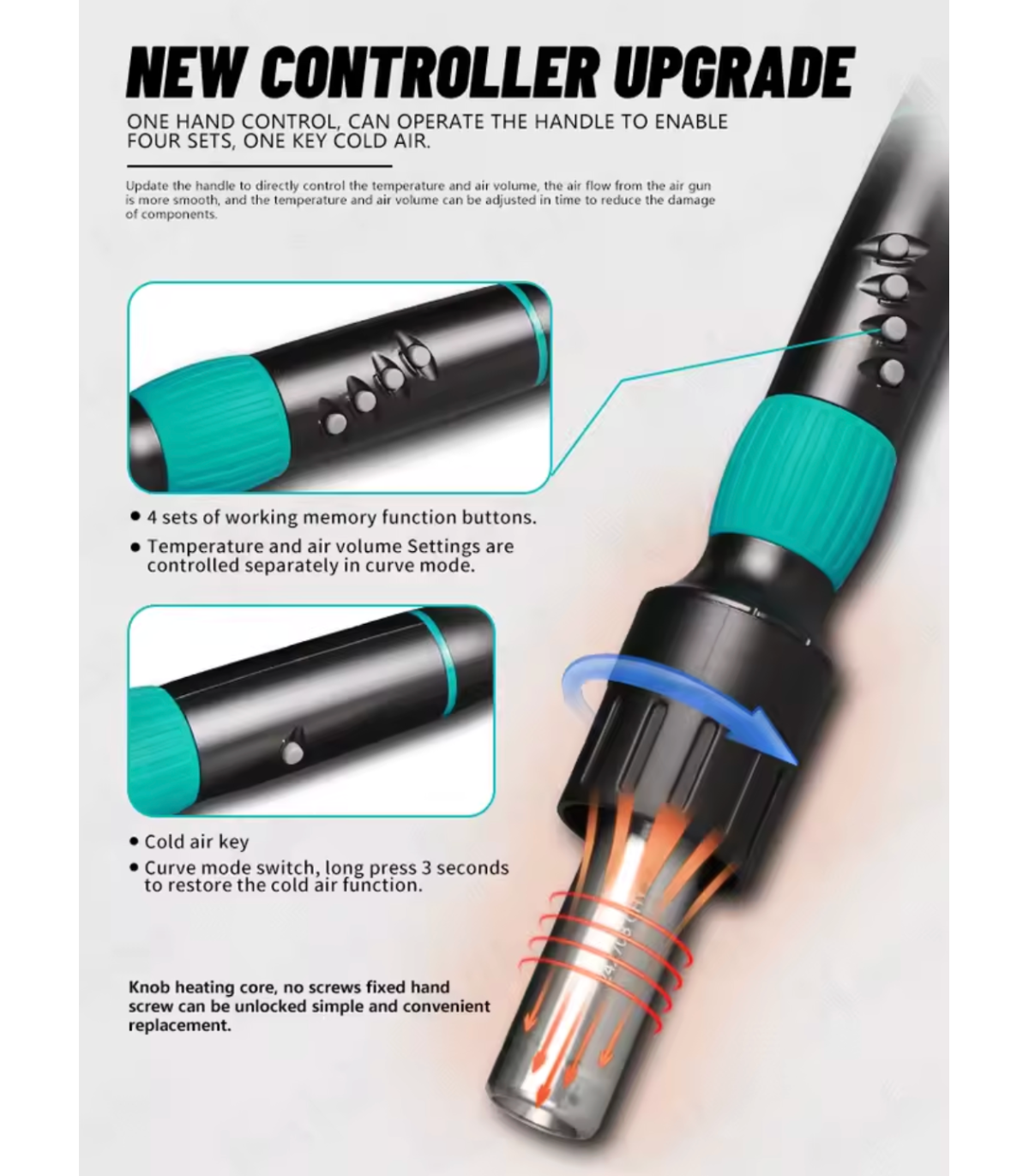 New knob-type heating element design allows easy replacement by hand without screws. Comes with 7A and 11B heating elements.