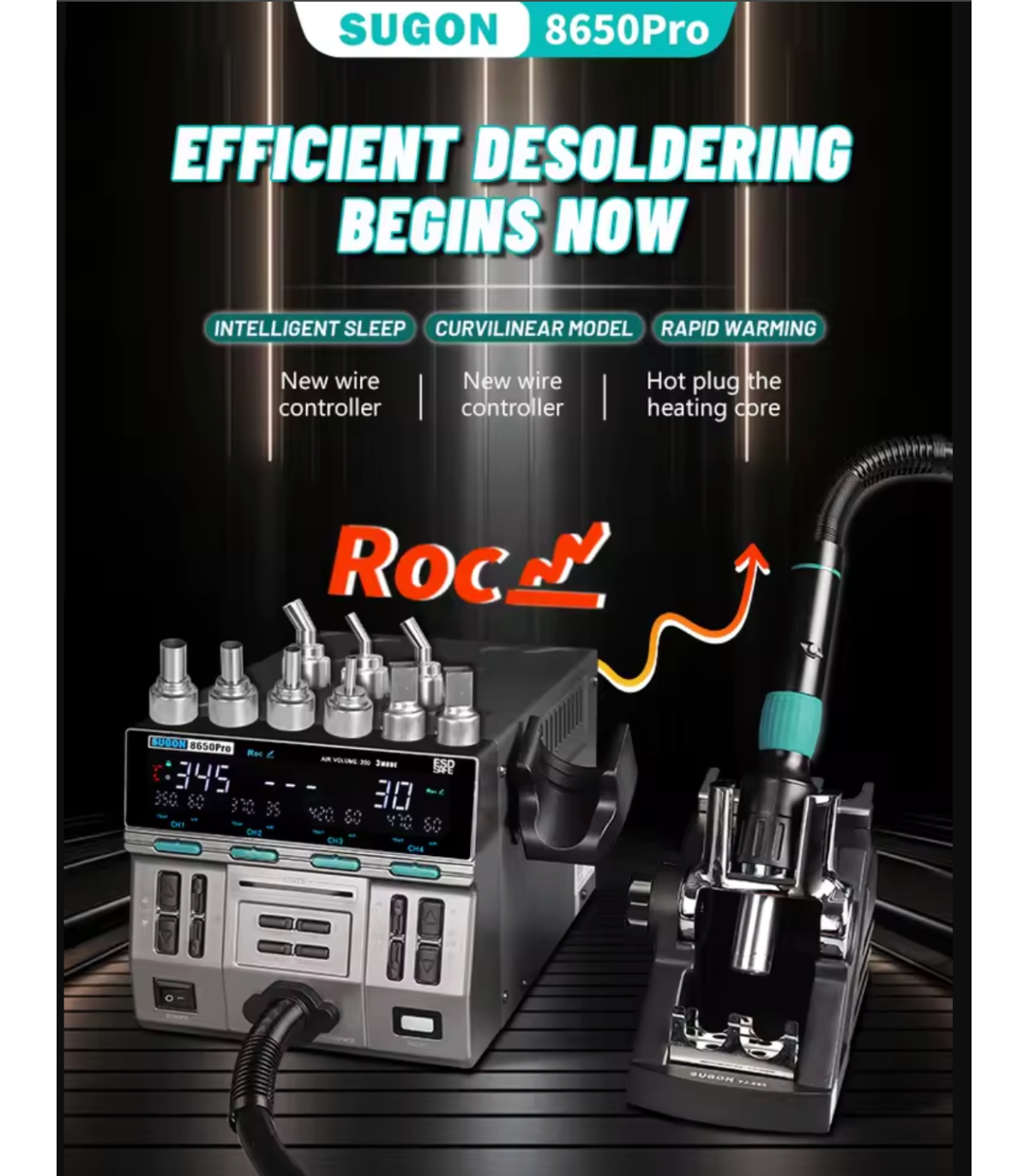 The SUGON 8650Pro 1300W hot air rework station supports three heating modes, including the curve mode which can be used with a dedicated bracket to free both hands during motherboard repair. With upgraded heating elements, wired handle control, and improved thermal efficiency, this station is ideal for professional repair technicians.