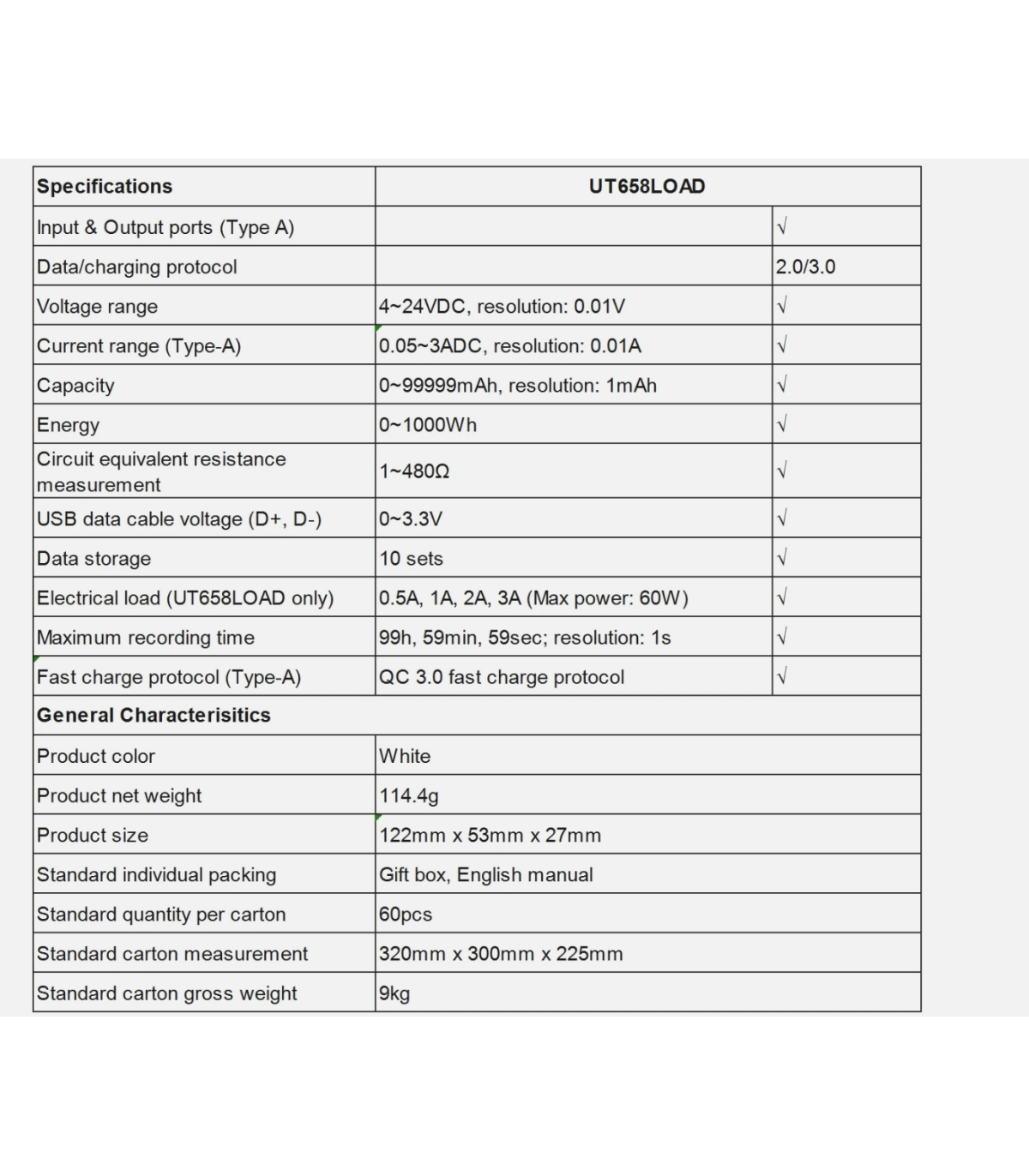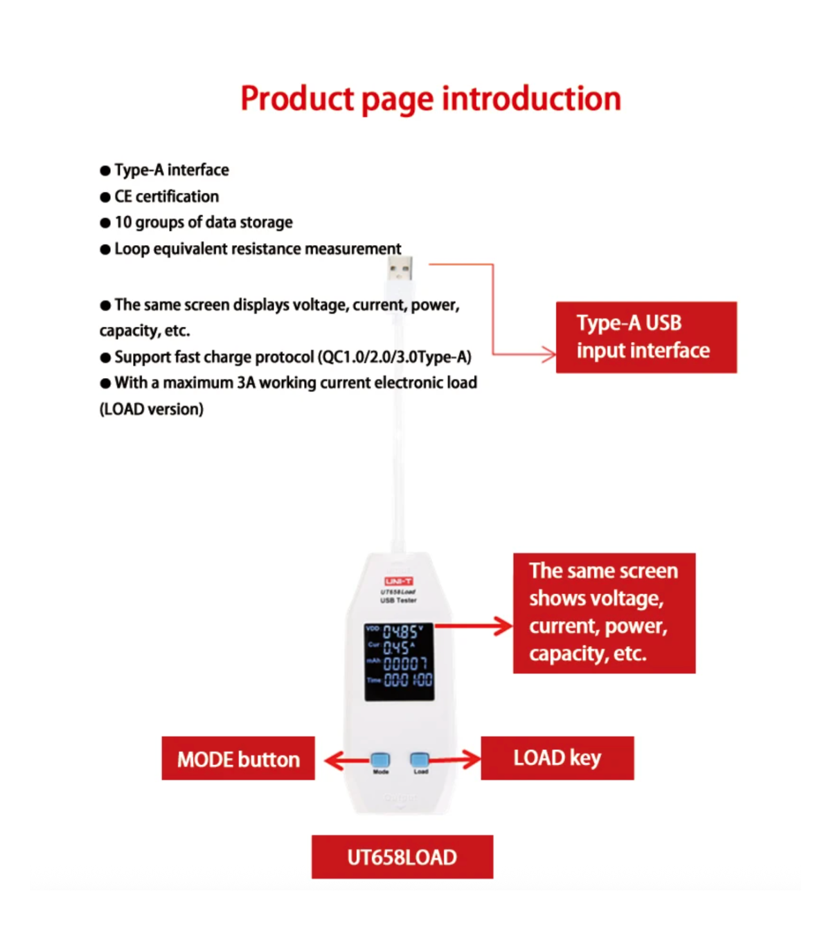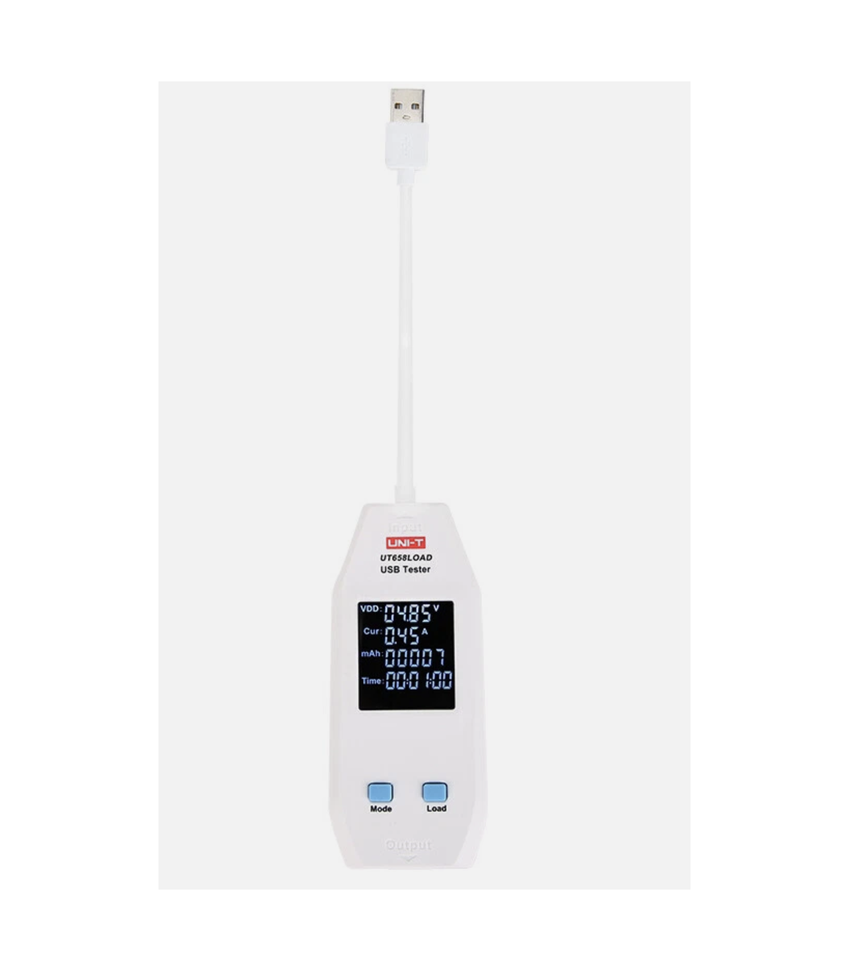 The UNI-T UT658Load USB Tester is a digital lcd meter designed to measure voltage, current, power, and capacity of USB devices. It helps test charging performance, detect cable quality, and monitor power usage in real time. Suitable for phones, tablets, laptops, and power banks.